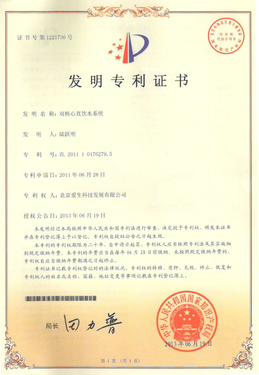 本項目是愛生”雙核心直飲水系統(tǒng)“新技術(shù)在工程上的首次應(yīng)用,與中國光大銀行合作,該項目被認(rèn)定為”中關(guān)村國家自主創(chuàng)新示范區(qū)首(臺)套重大技術(shù)裝備示范項目“,是愛生科技在總結(jié)大型直飲水凈化系統(tǒng)設(shè)計經(jīng)驗和用戶在安全和節(jié)能方面更高的使用需求基礎(chǔ)上,通過兩個核心過濾技術(shù)的有機(jī)結(jié)合,結(jié)合運用自控自檢技術(shù),合理的設(shè)置膜單元流量參數(shù),包括膜單元濃水循環(huán)流量和膜單元濃水排放流量,合理調(diào)整各個膜段的入水量和產(chǎn)水量及壓力,提高其產(chǎn)水量,降低濃廢水的比例。同時通過與廢水裝置和中水系統(tǒng)的整合設(shè)計,廢水利用率達(dá)到100%,并且“雙核心直飲水系統(tǒng)”從控制角度和處理工藝上更高效地對安全飲水給予了充分保障,完全規(guī)避了由于水源突發(fā)性污染或自然災(zāi)害等突發(fā)事件而帶來的對直飲水出水水質(zhì)的影響。對直接飲用水安全的保證及和諧社會的建設(shè),即飲水安全是建設(shè)和諧社會的基礎(chǔ)和支撐有著現(xiàn)實的實際意義。