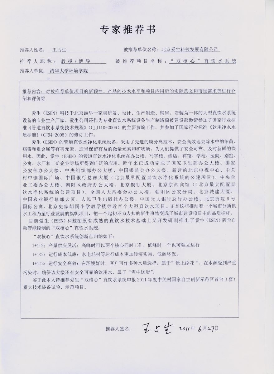 愛(ài)生(ESEN)是中國(guó)致力于大型管道直飲水凈化系統(tǒng)設(shè)備研發(fā)和生產(chǎn)的國(guó)家級(jí)高新技術(shù)企業(yè),為廣大客戶提供高品質(zhì)的樓宇直飲水設(shè)備解決方案,17年來(lái)愛(ài)生公司已成功為國(guó)家衛(wèi)生部辦公大樓、國(guó)家公安部辦公大樓、中央組織部辦公大樓、國(guó)家體育總局辦公大樓、中國(guó)銀監(jiān)會(huì)辦公大樓、中央企業(yè)工委辦公大樓、北京電視中心(BTV)、中關(guān)村中鋼國(guó)際廣場(chǎng)、中國(guó)銀行總部大廈(北京最早配置直飲水凈化系統(tǒng)的公建項(xiàng)目)、國(guó)家開(kāi)發(fā)銀行總行辦公大樓、北京銀行總行大廈、北京京西賓館、全國(guó)人大常委會(huì)辦公大樓、朝陽(yáng)區(qū)公安分局,朝陽(yáng)區(qū)政府辦公大樓、北京城建大廈、中國(guó)農(nóng)業(yè)銀行總部大廈、北京貢院6號(hào)國(guó)際公寓、北京史家胡同小學(xué)本部等定制設(shè)計(jì)了一百多個(gè)大型直飲水工程項(xiàng)目。